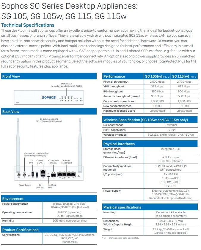 The desktop firewall appliances offer an excellent price-to-performance ratio making them ideal for budget-conscious small businesses or branch offices. They are available with or without integrated 802.11ac wireless LAN, so you can even have an all-in-one network security and hotspot solution without the need for additional hardware. Of course, you can also add external access points. With Intel multi-core technology designed for best performance and efficiency in a small form factor, these models come equipped with 4 GbE copper ports built-in and 1 shared SFP interface, e.g. for use with our optional DSL modem or an SFP transceiver for fiber connectivity. An optional second power supply provides an unmatched redundancy option in this product segment.
