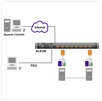8埠雙滑軌LCD KVM多電腦切換器 KL9108為一台以網路IP為基礎的KVM控制裝置,讓近端與遠端的操作人員能夠從多控制端中,監控與存取多部電腦。每一台KL9108能夠管理最多8部電腦,同時亦可透過網路從遠端進行存取控制。KL9108的主要特性為搭載可獨立抽拉的17" LCD螢幕,與內建觸控板的鍵盤。為了將資料中心的空間最大化,在不使用鍵盤的時候,可以將其「隱藏起來」,而薄型LCD螢幕能夠持續監控電腦。